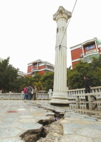 地表開裂塌陷,4根燈柱傾斜,噴水池保護欄出現(xiàn)不同程度損壞……近日,南安普蓮住宅小區(qū)居民洪先生撥打新聞熱線0595-26531010反映,該小區(qū)的音樂噴泉廣場存在多處安全隱患,情況已經(jīng)持續(xù)了一兩年時間。