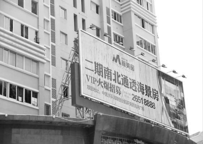 楊先生房子位于東星荷景園東區(qū)3號樓605。楊女士告訴記者,套房是她哥哥2009年買的,去年本來打算裝修房子,但因她眼睛動手術只能暫時拖延,不想今年元月再來看房子,發(fā)現(xiàn)陽臺外豎起了一個巨大廣告牌,把視線都擋住了,完全看不到外面,這讓她只能將裝修計劃擱置。