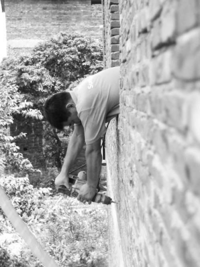 在柳城街道露江工業(yè)區(qū)一棟民房二樓。在烈日下,記者看到,李寶的搭檔趙站民正彎著腰,半個身子探出窗外,在墻上打下4個外機(jī)支架孔,擰上4個螺絲,再把80斤重的外機(jī)抬到支架上,用4個螺絲鎖緊,再連接內(nèi)外機(jī)通管,而這些就要花去他20分鐘的時間。