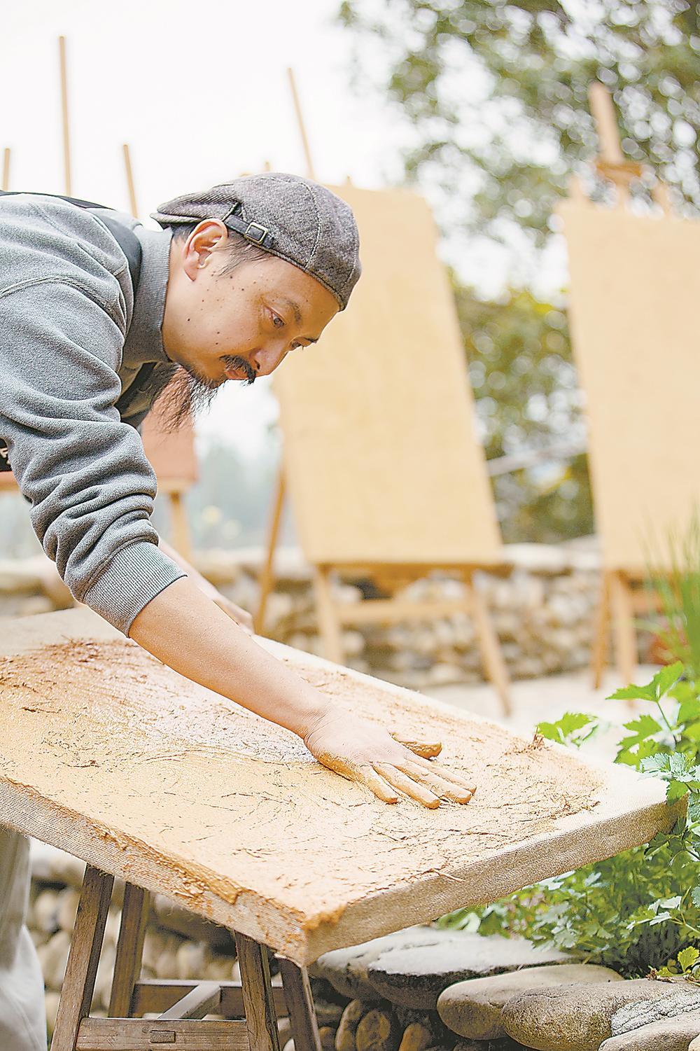 22日,武夷巖彩畫師胡磊正在制作巖彩畫板。