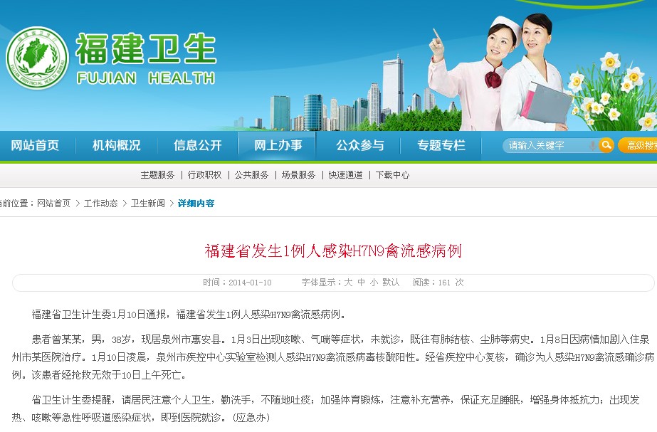 14日:晉江一男子感染H7N9禽流感目前病情危重
